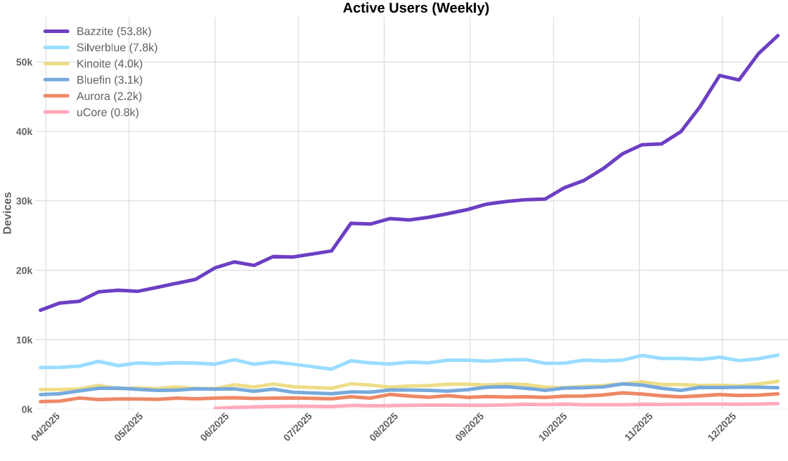 Graphs can be found here on their github. Since around mid November the active user count for Bazzite has gone up by around 16k active users.