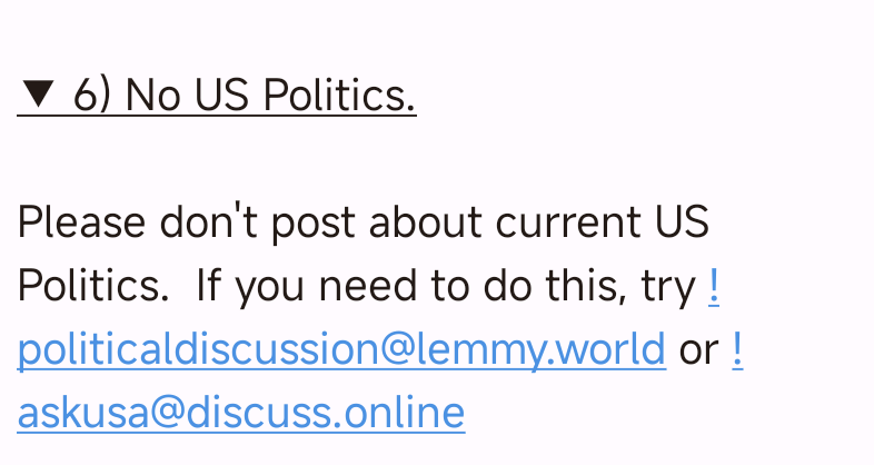 minus-squarecosmicrookie@lemmy.worldOPlinkfedilinkarrow-up5arrow-down1·15 days agoNo It has nothing to do with politics. The question is about the rule of this Community .the rule is about politics but the question is why the rule specifically applies to a very narrow area of politics